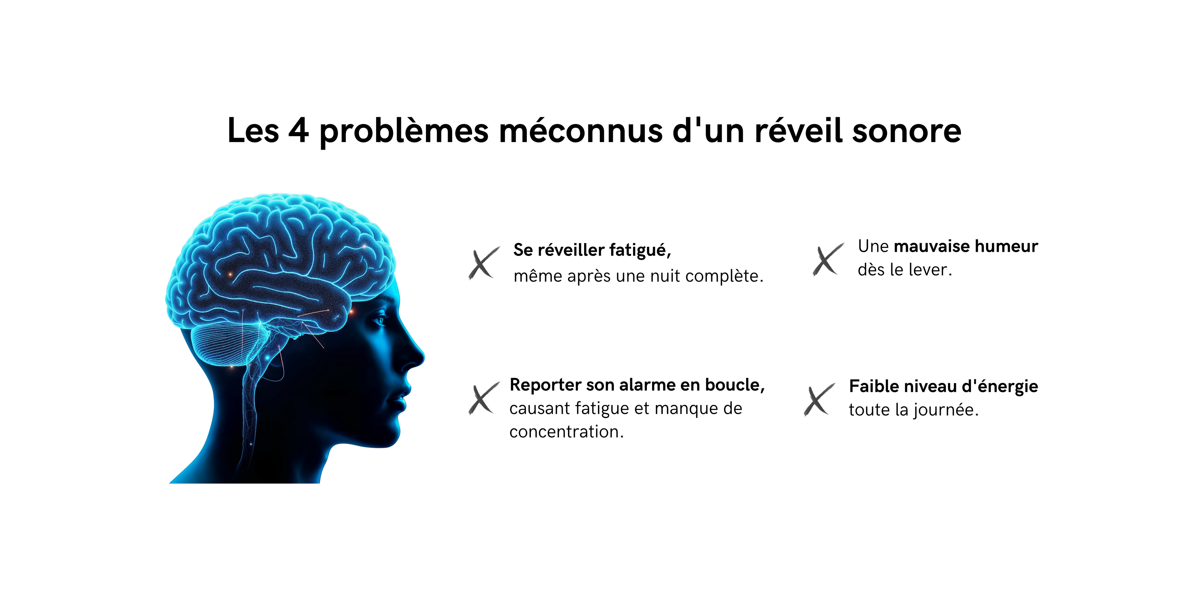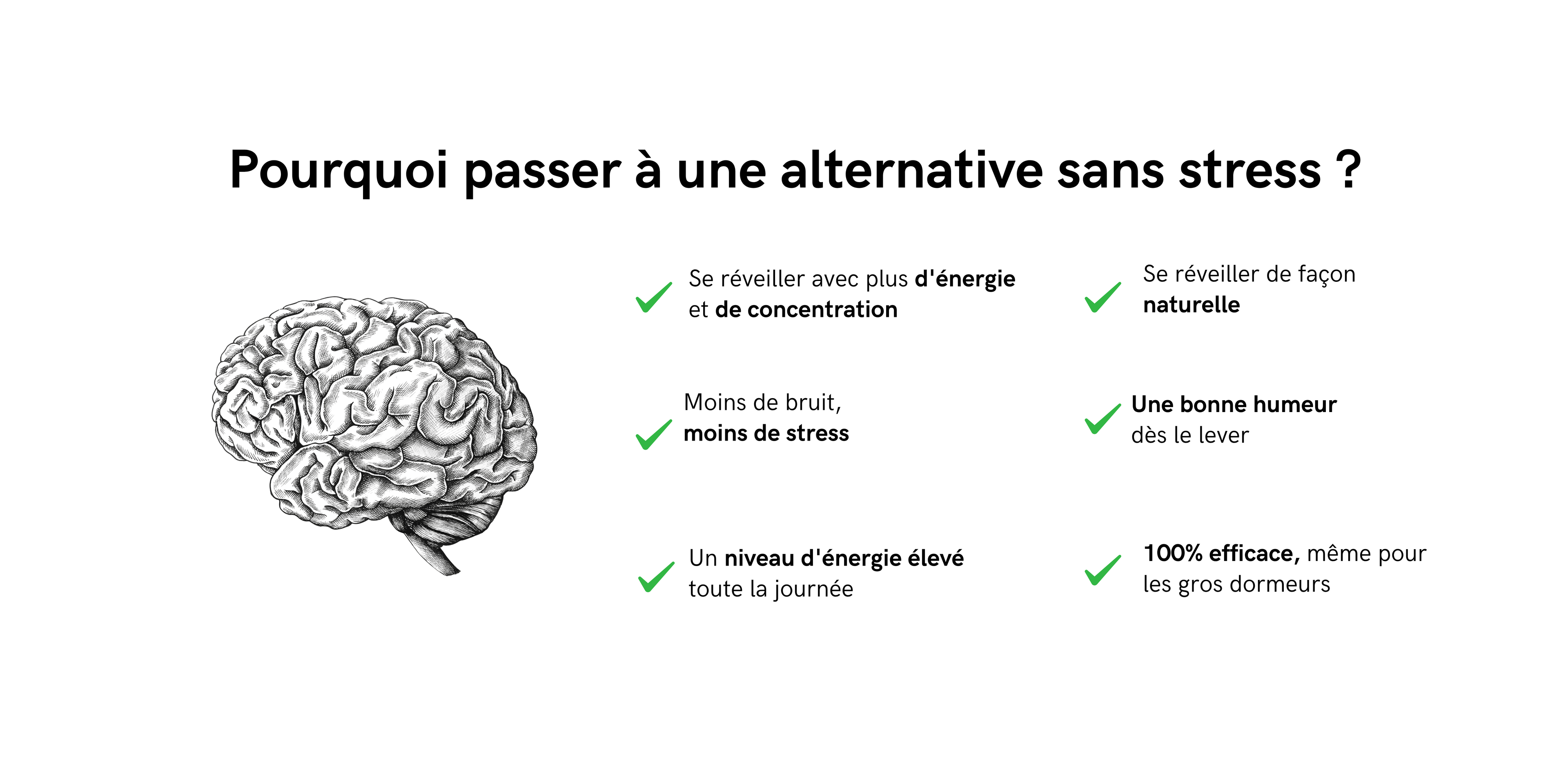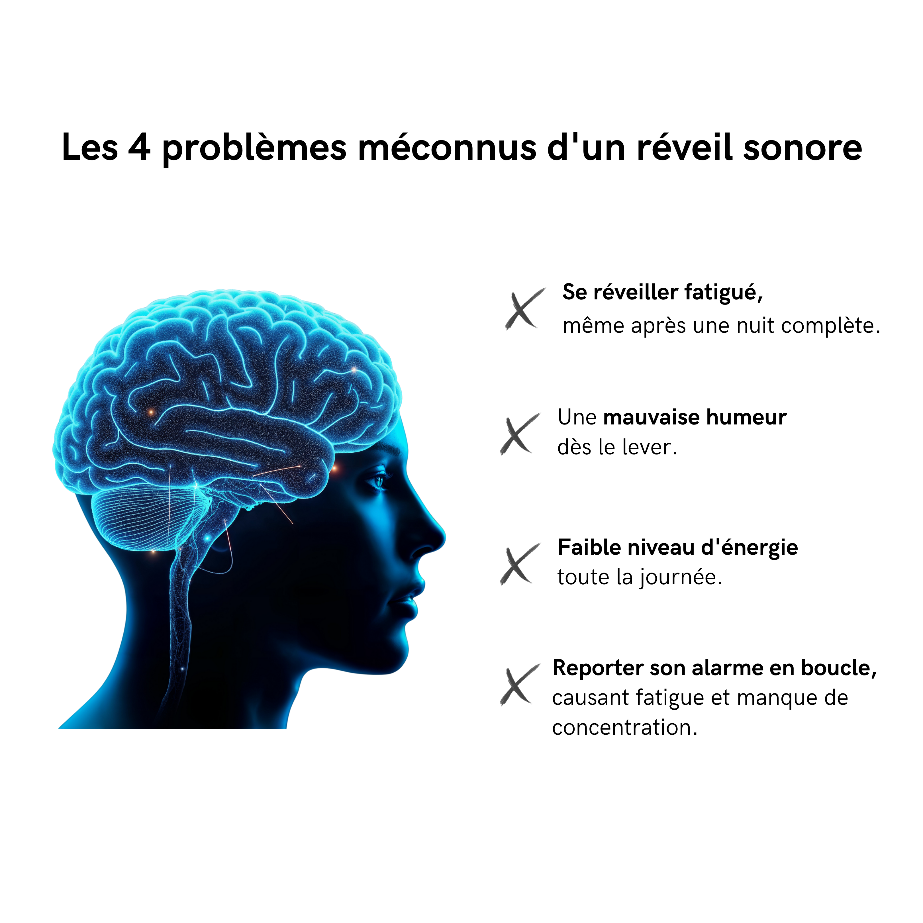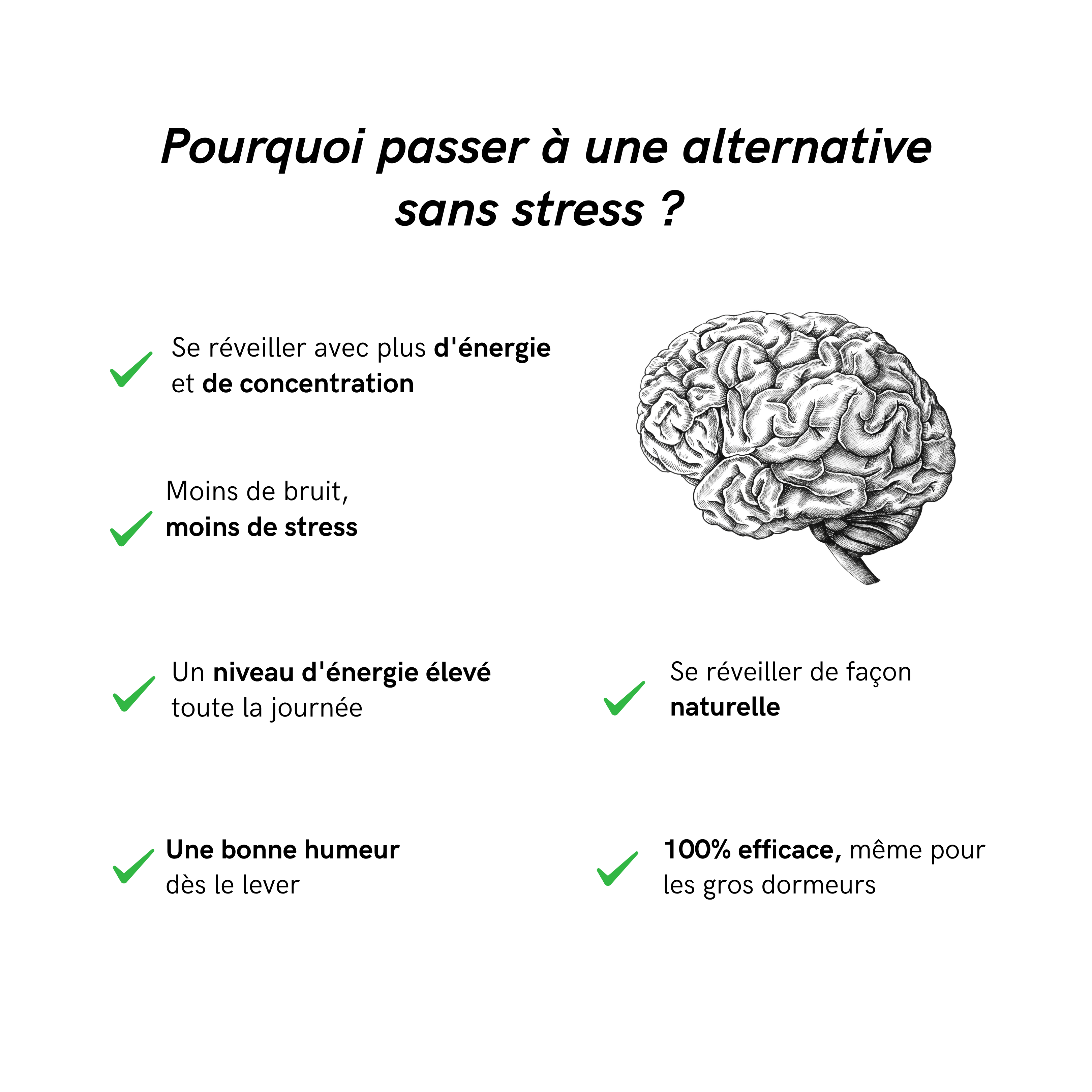 Des études montrent que se réveiller au son d'un réveil brutal, comme celui d'un réveil traditionnel, peut déclencher une réaction de stress. Au lieu d'aborder la journée en douceur, on peut se sentir surpris et somnolent, ce qui peut nuire à son énergie, à son humeur et à sa concentration tout au long de la journée.