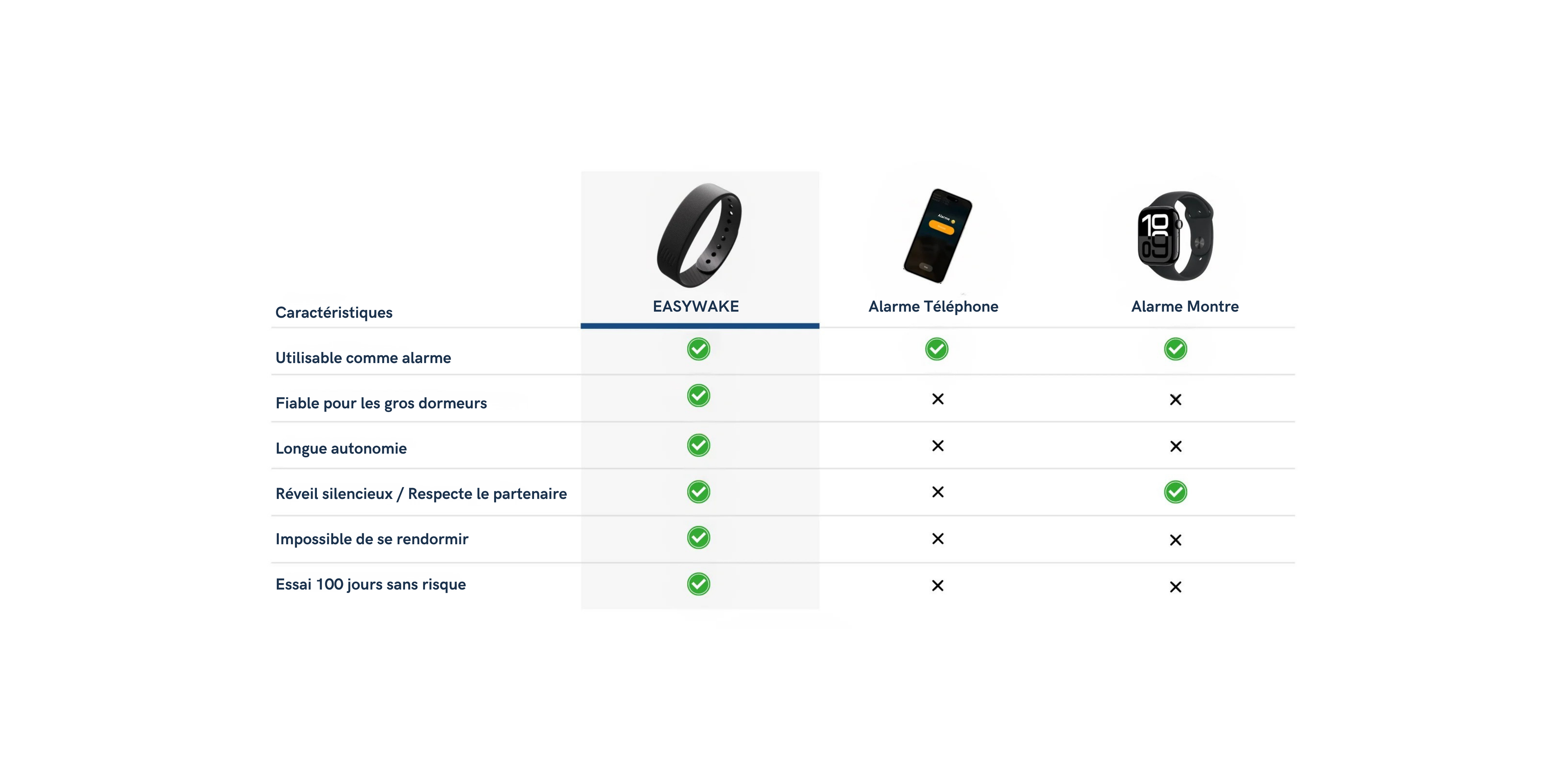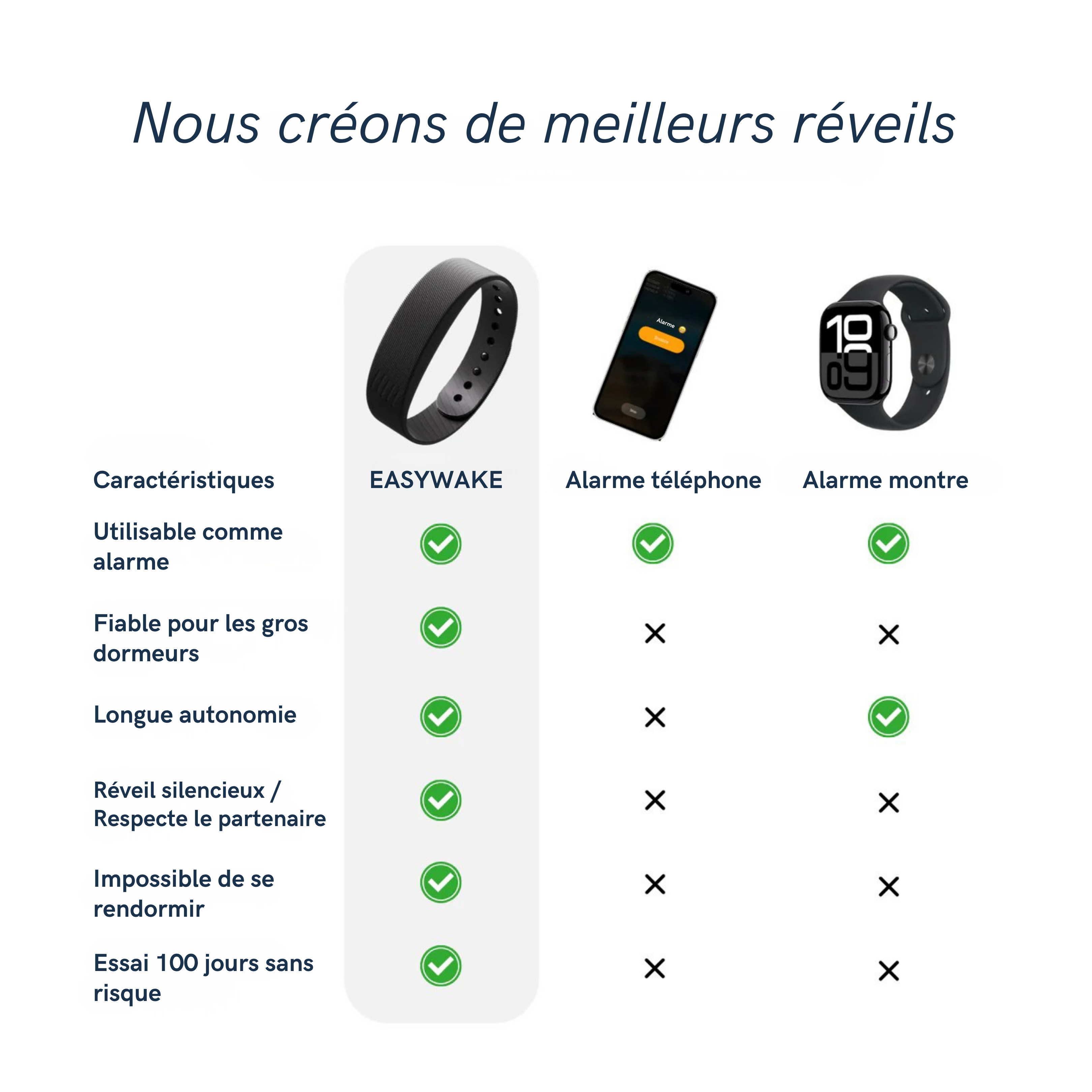 L'alarme EasyWake vous réveille silencieusement avec de douces vibrations sur votre poignet, pour que vous vous réveilliez seul, calmement et naturellement, sans son ni écran.