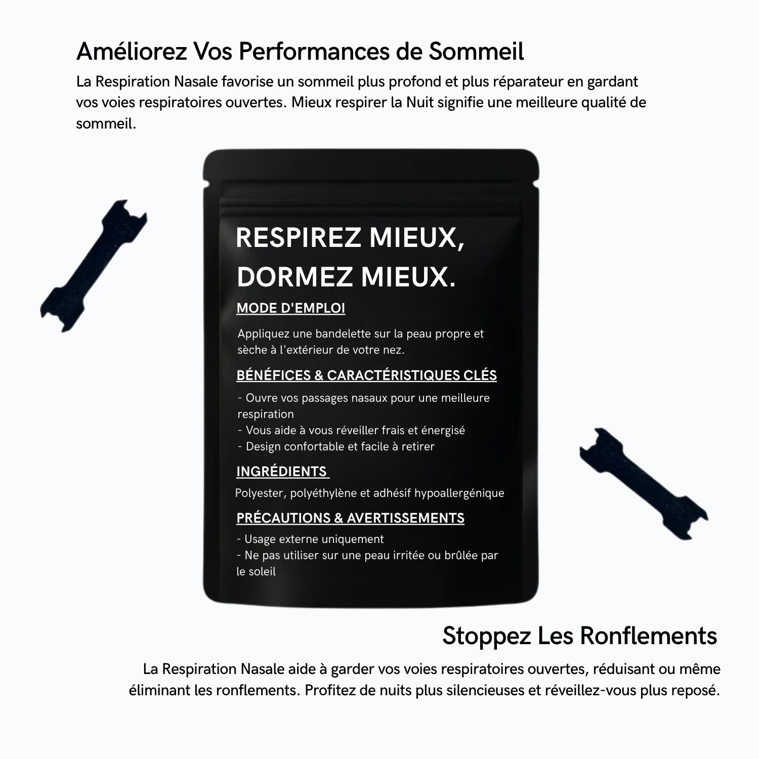 Nos sparadraps buccaux et nasaux sont destinés à un usage externe non médical uniquement. Ces produits sont destinés à favoriser la respiration nasale et le confort général du sommeil chez les personnes en bonne santé. Ce ne sont pas des dispositifs médicaux et ne sont pas destinés à diagnostiquer, traiter, guérir ou prévenir une quelconque maladie ou affection, y compris (mais sans s'y limiter) l'apnée du sommeil, l'asthme, les allergies ou autres troubles respiratoires.